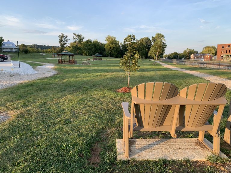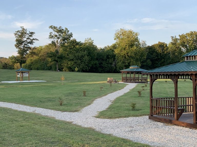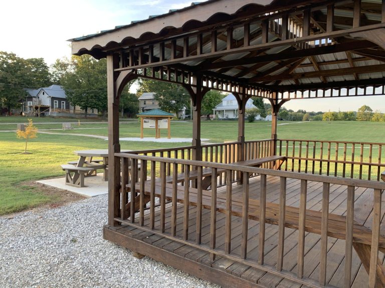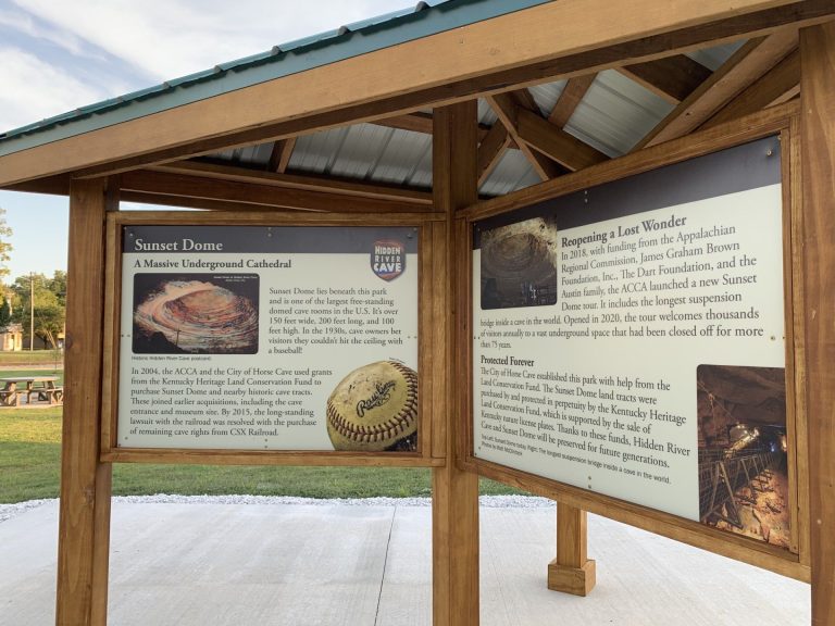 Horse Cave’s Sunset Dome Park at the corner of Main and Smith Streets (on the former site of the Owens Hotel) is located on top of Hidden River Cave’s huge Sunset Dome and a 6-panel covered exhibit is nestled amid the 2/3 mile walking trail, gazebos, and Adirondack chairs.